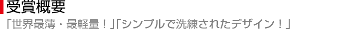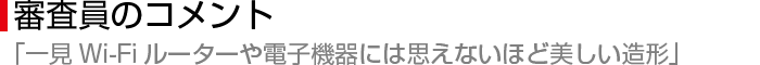 Wi-Fiルーターとして世界最薄、最軽量というコンパクトな本体は、携帯性が圧倒的に高く、名刺入れにも収まるサイズというから驚きである。またバッテリーの駆動時間においても申し分無く、毎日使う事を考えると非常に魅力的な製品であると言える。またスリム感を強調した美しいスタイリングがなされており、一見Wi-Fiルーターや電子機器には思えないほど美しい造形となっている。電源ボタンのみのインターフェイスや、持ったときの心地よさ、丁寧なパッケージデザインなど、全体的に好感が持てるクオリティが高評価となった。